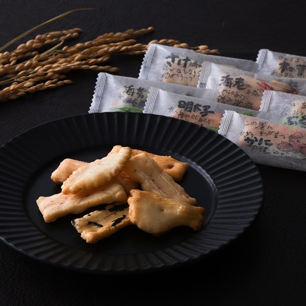 海鮮系のおかきを中心に8種詰め込みました。(海老・かに・こんぶ・明太子・鮭・ふぐ・海苔・木の葉)食べやすい一口サイズで、少しずつ色んな味を楽しみたい方におすすめ。