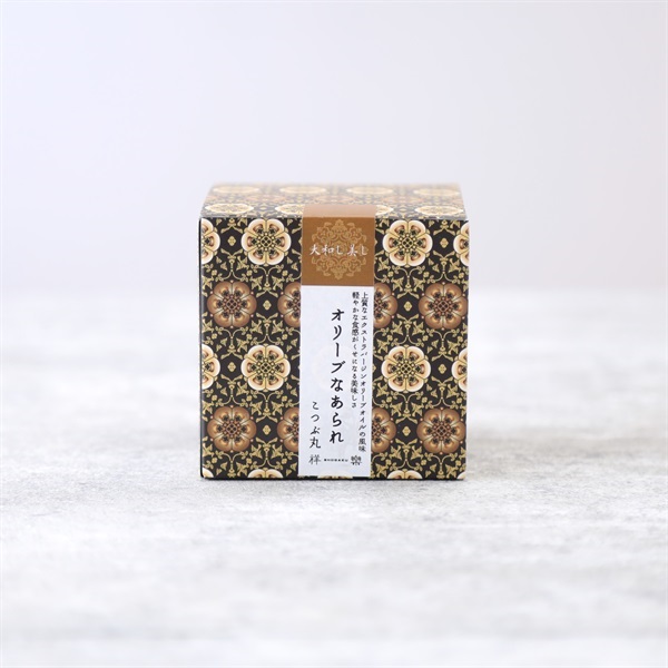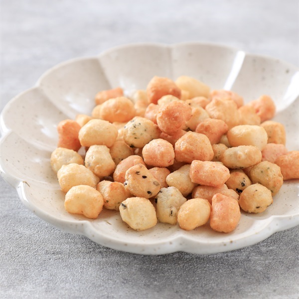 こつぶ丸:もち米(国産)、オリーブ油、食塩、ごま、調味塩(たん白加水分解物、ポークエキス、野菜エキス、香辛料)、えび、粉末醤油、あおさ、ホタテ貝エキス(酵母エキス、ほたて、還元水あめ)、デキストリン、ブドウ糖、青海苔/調味料(アミノ酸等)、加工デンプン、着色料(紅麹)、甘味料(甘草、ステビア)(一部にえび・小麦・ごま・大豆・豚肉を含む)
